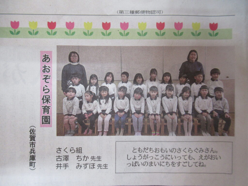 昨日(2月16日付)の佐賀新聞の『もうすぐ1年生』の欄に、さくら組さんの写真が掲載されました。