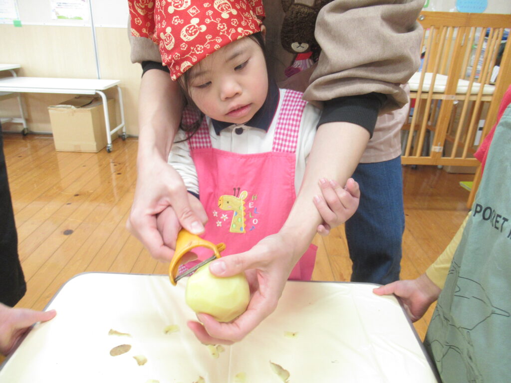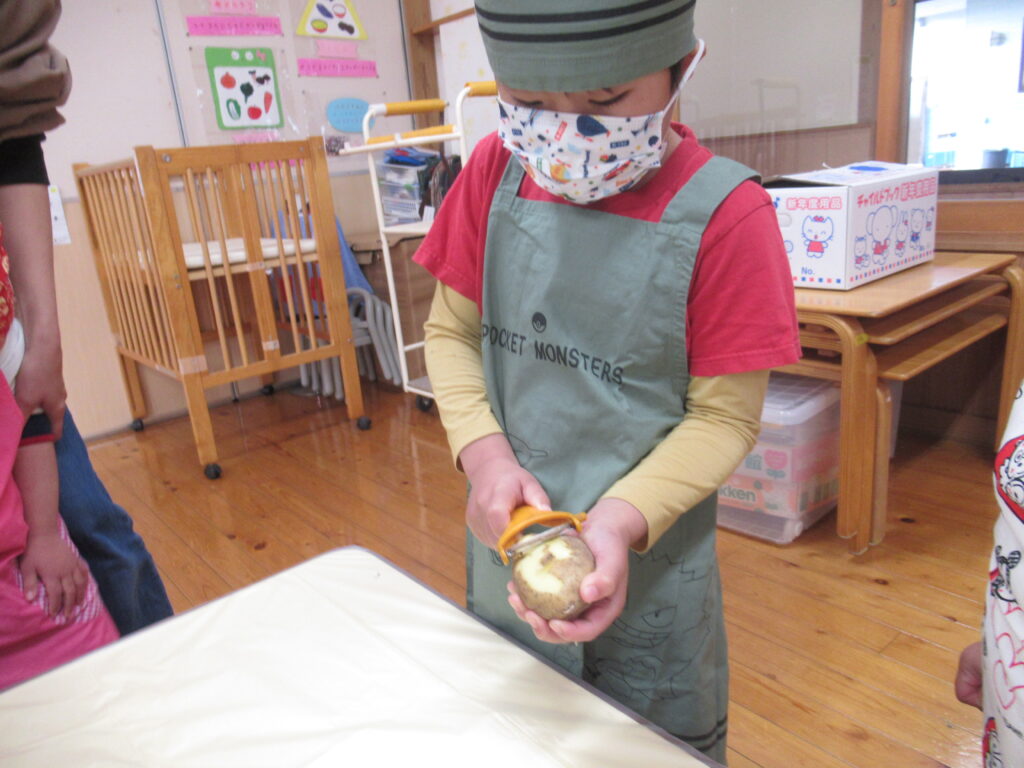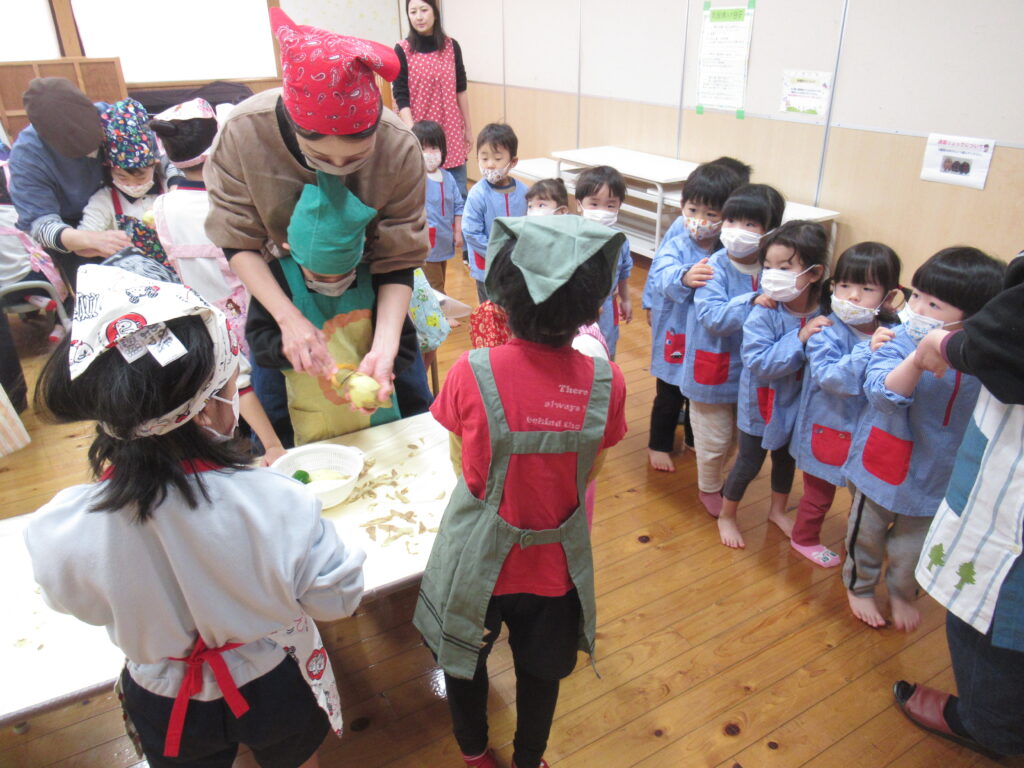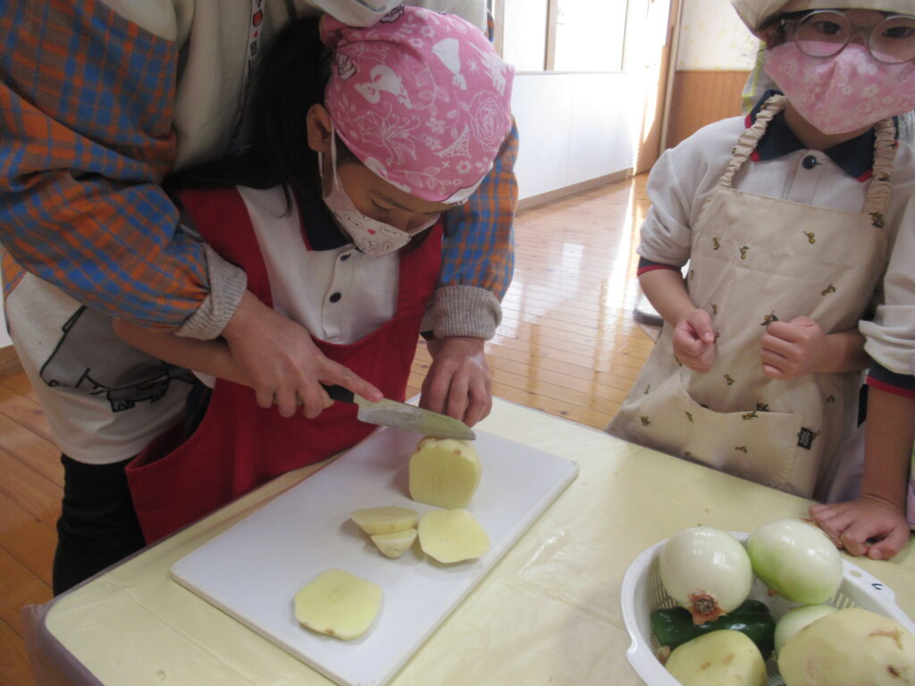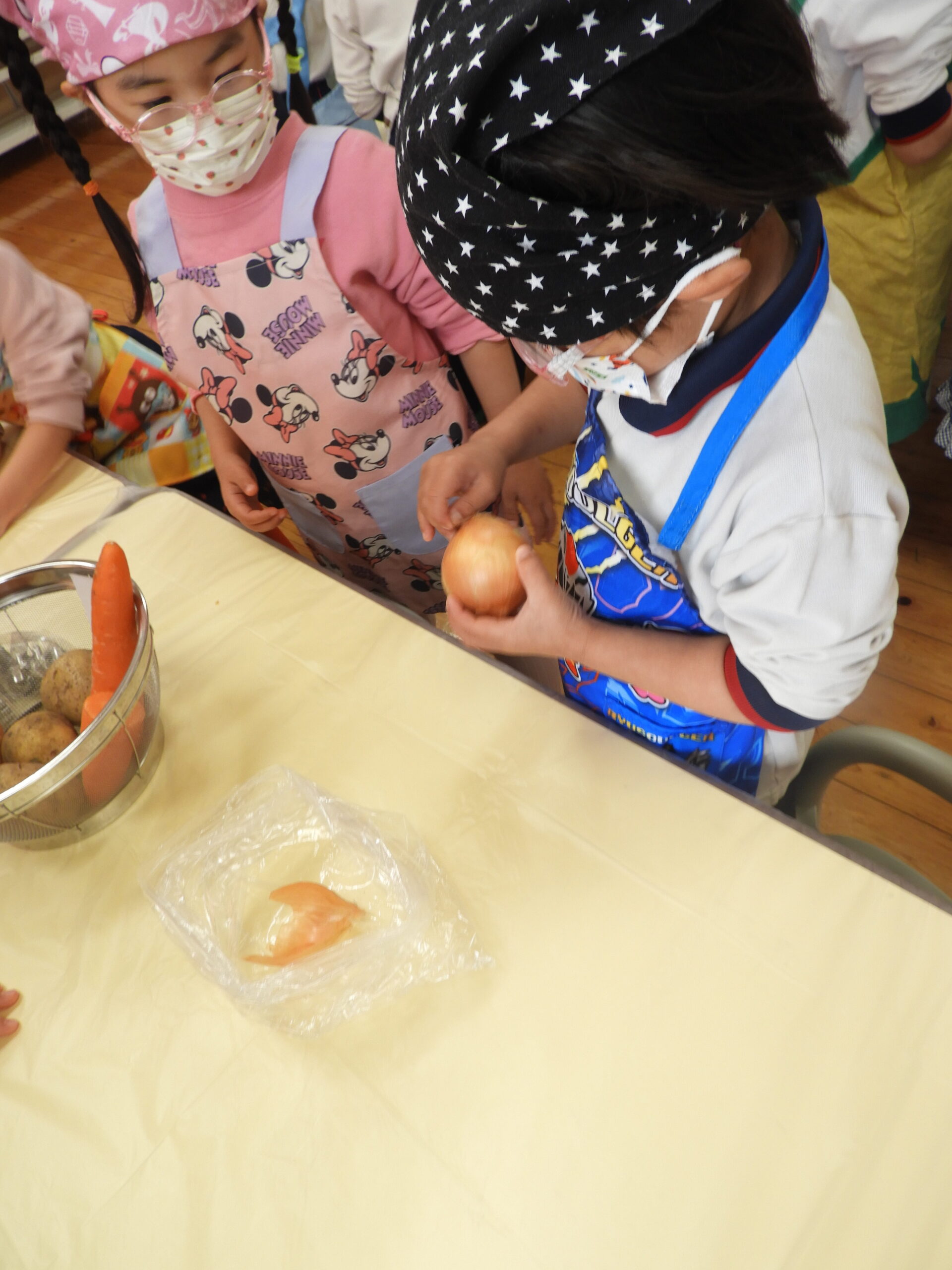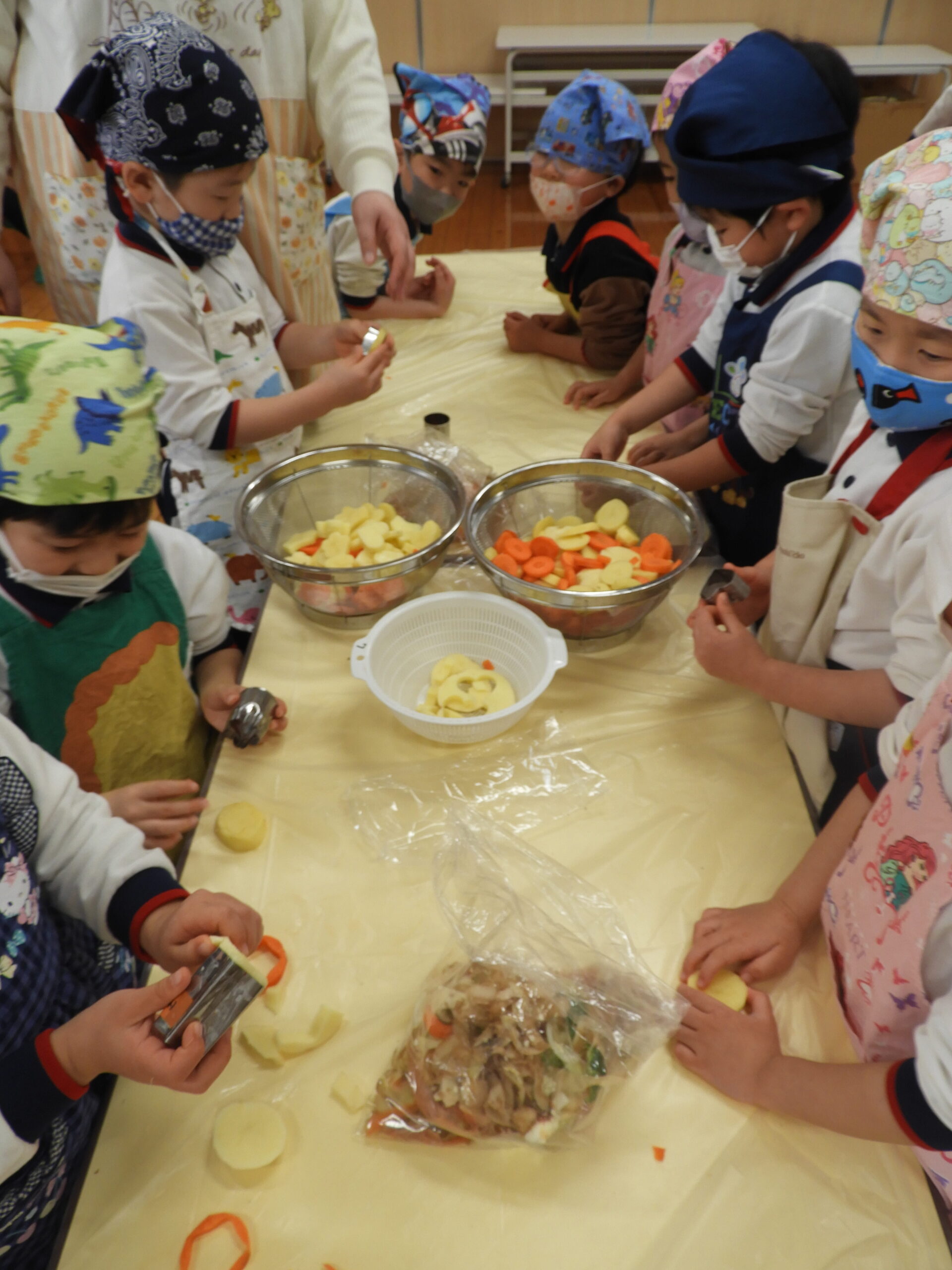 さくら組さんと協力して、にんじん、じゃがいも、たまねぎの皮むきと、3つの野菜をさくら組さんが切ってくれた後に型抜きをしました。「一人でやってみる!」と挑戦する姿も見られましたよ。