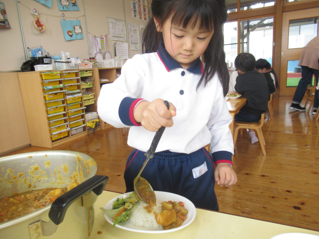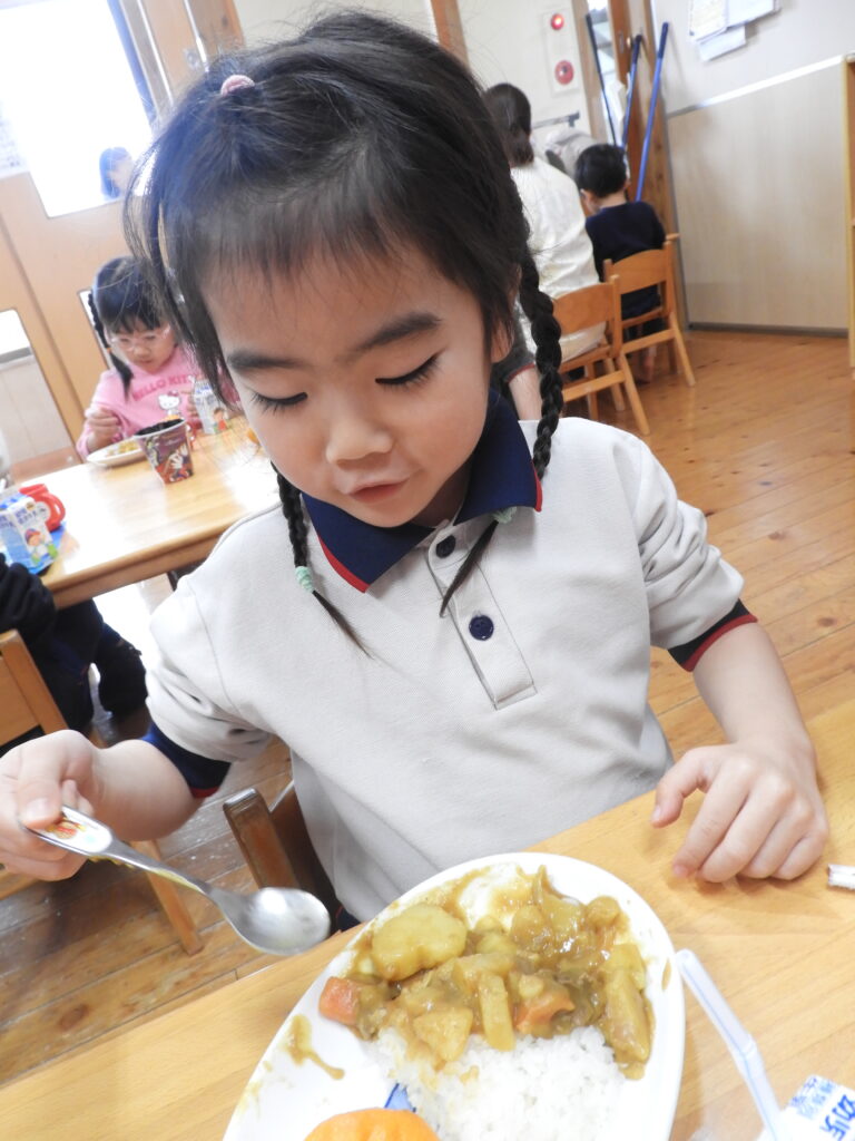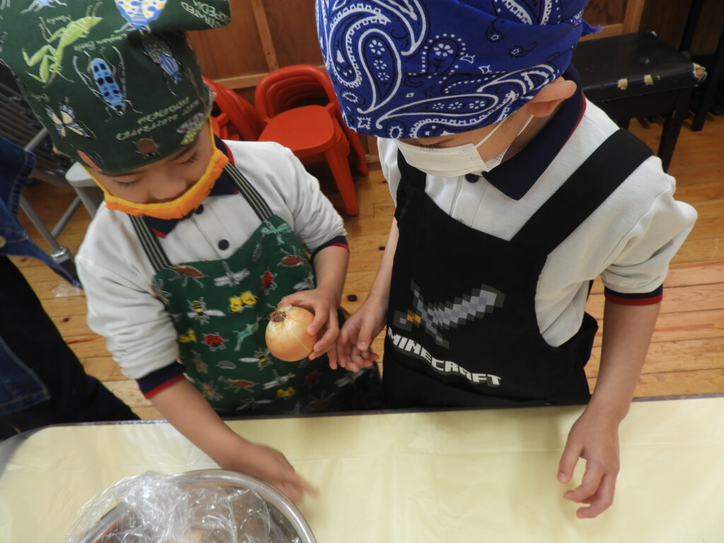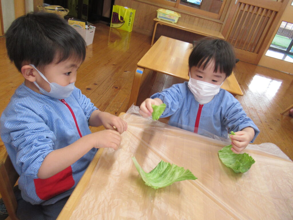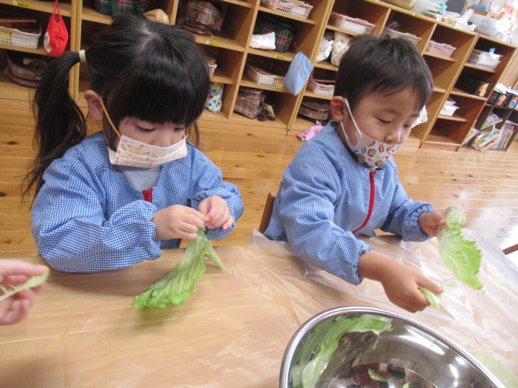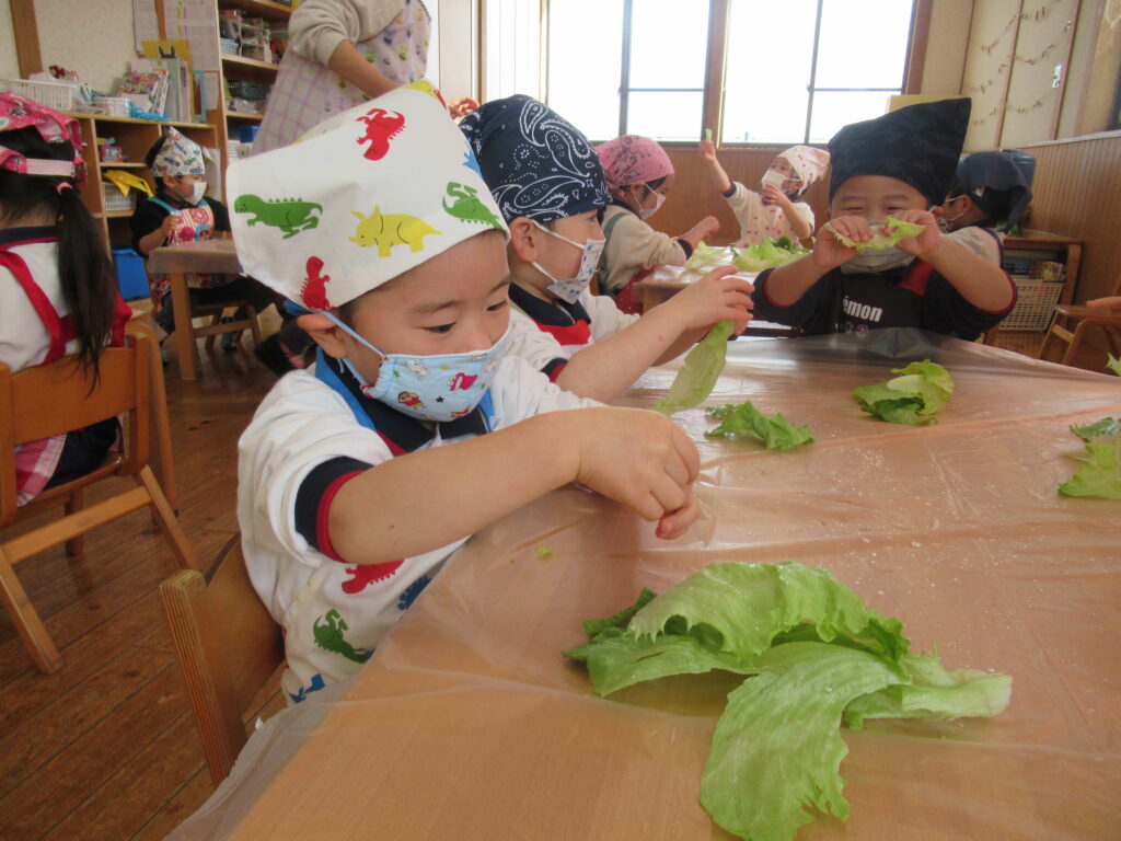 さくら組さんと協力して、にんじん、じゃがいも、たまねぎの皮むきと、3つの野菜をさくら組さんが切ってくれた後に型抜きをしました。「一人でやってみる!」と挑戦する姿も見られましたよ。