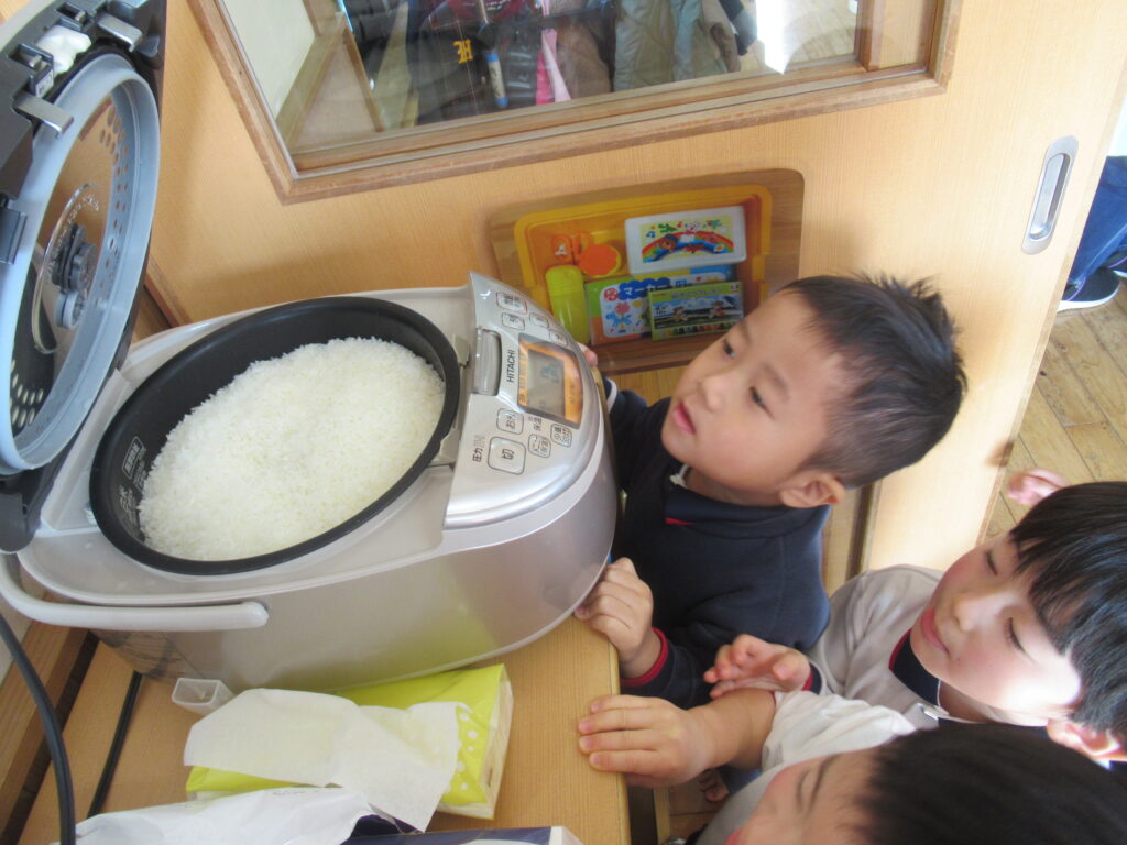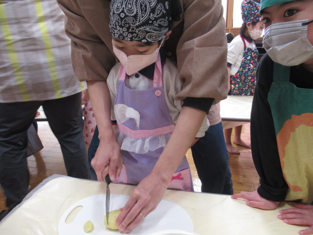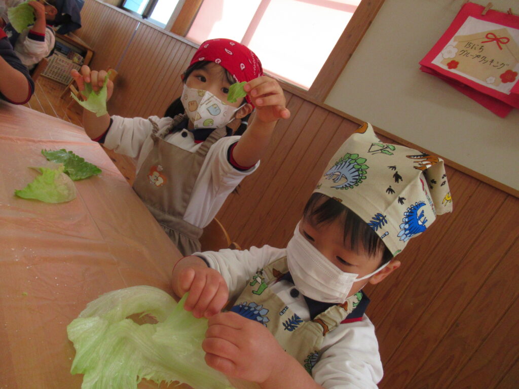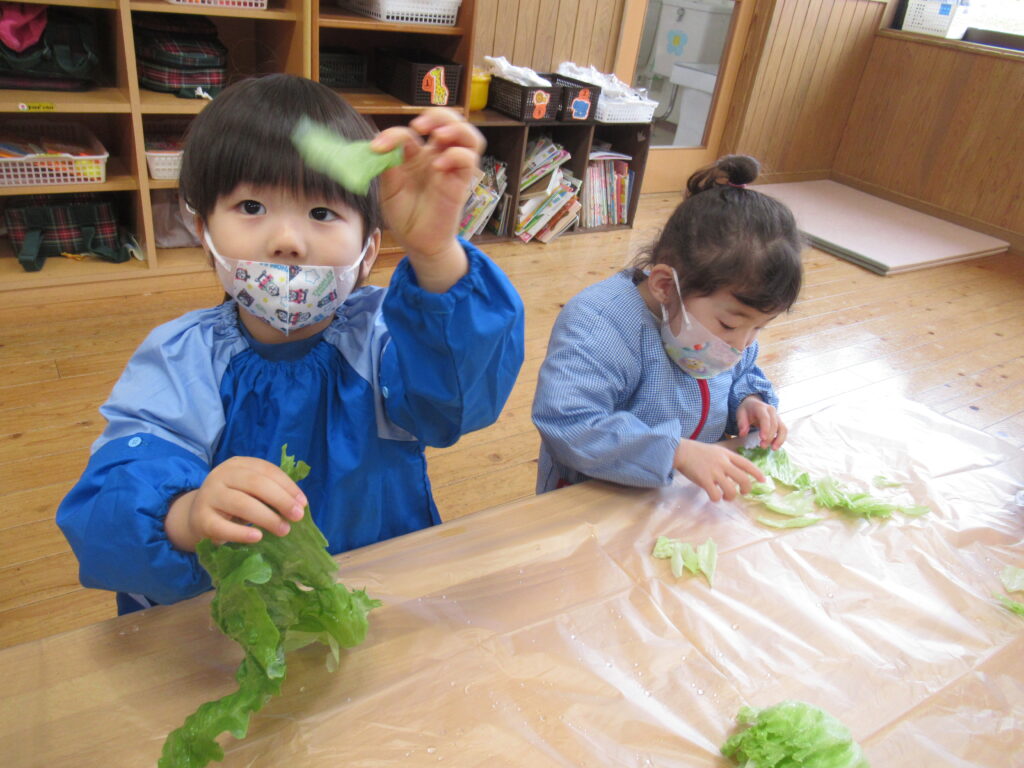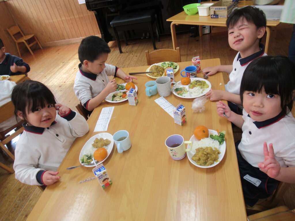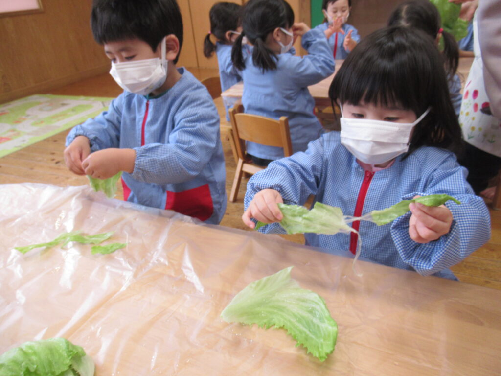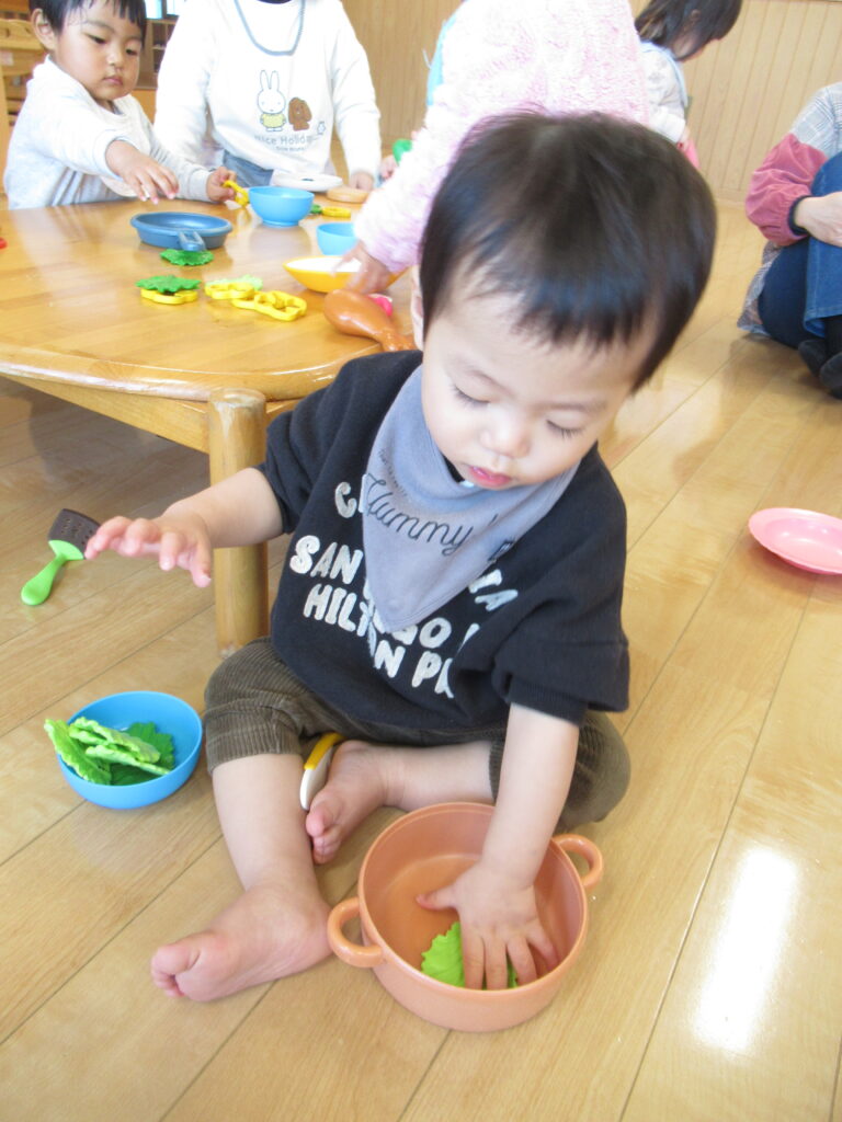 さくら組さんと協力して、にんじん、じゃがいも、たまねぎの皮むきと、3つの野菜をさくら組さんが切ってくれた後に型抜きをしました。「一人でやってみる!」と挑戦する姿も見られましたよ。