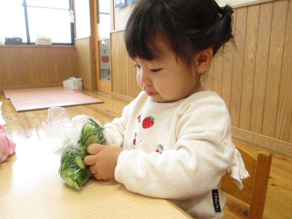 きゅうりの塩もみとポテトチップス砕きをしました。